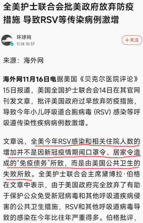 面对“免疫债”的说辞,美国全国护士联合会也刊发了文章予以驳斥,他们认为全美今年RSV感染和相关住院人数的增加并不是“免疫债务”所致,而是由美国公共卫生的失败所致。
