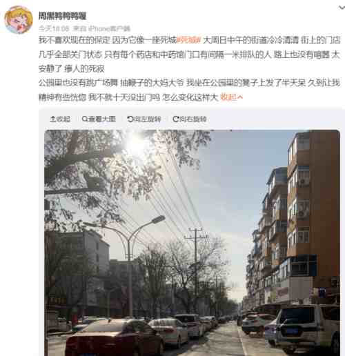 网友周黑鸭鸭鸭喔:我不喜欢现在的保定,因为它像一座死城,大周日中午的街道冷冷清清,街上的门店几乎全部关门状态,只有每个药店和中药馆门口有间隔一米排队的人,路上也没有喧器太安静了瘆人的死寂。