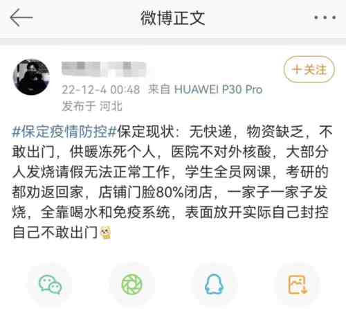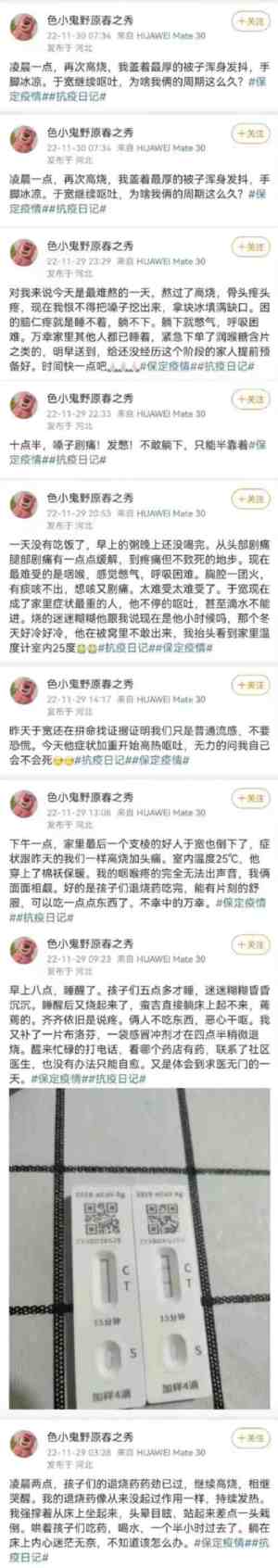 匿名网友:无快递,物资缺乏,不敢出门,供暖冻死个人,医院不对外核酸,大部分人发烧请假无法正常工作,学生全员网课,考研的都劝返回家,店铺门脸80%闭店,一家子一家子发烧,全靠喝水和免疫系统,表面放开实际自己封控自己不敢出门。