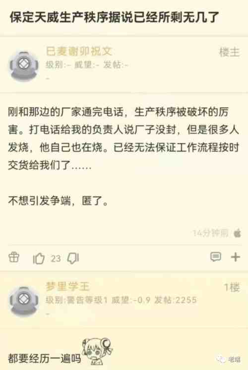 网友已麦谢卯祝文:刚和那边的厂家通完电话,生产秩序被破坏的厉害。打电话给我的负责人说厂子没封,但是很多人发烧,他自己也在烧。已经无法保证工作流程按时交货给我们了.…不想引发争端,匿了。