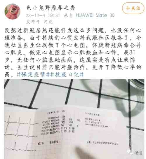 网友原春之秀:没想过新冠居然还能引发这么多问题,也没任何心理准备。由于持续的心慌发抖我跟社区报备了,今晚社区医生让我做了个心电图,怀疑新冠病毒合并心肌炎。做完心电图显示心肌缺血和心悸。我31岁,无任何心脏基础疾病。