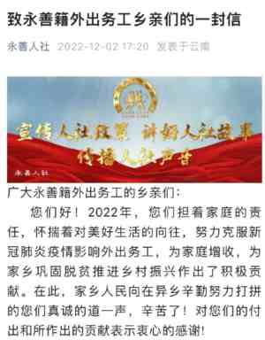 说句实在话,永善的这封公开信写得还是情真意切的,在信中充分体谅到了外出工作的辛苦及为家乡所做的贡献,也考虑到了乡亲们盼回乡的心情,并且当地驻上海闵行、浙江嘉兴、昆明等地的驻外就业服务工作站都在发挥着作用,包括政策咨询、转岗、维权等。