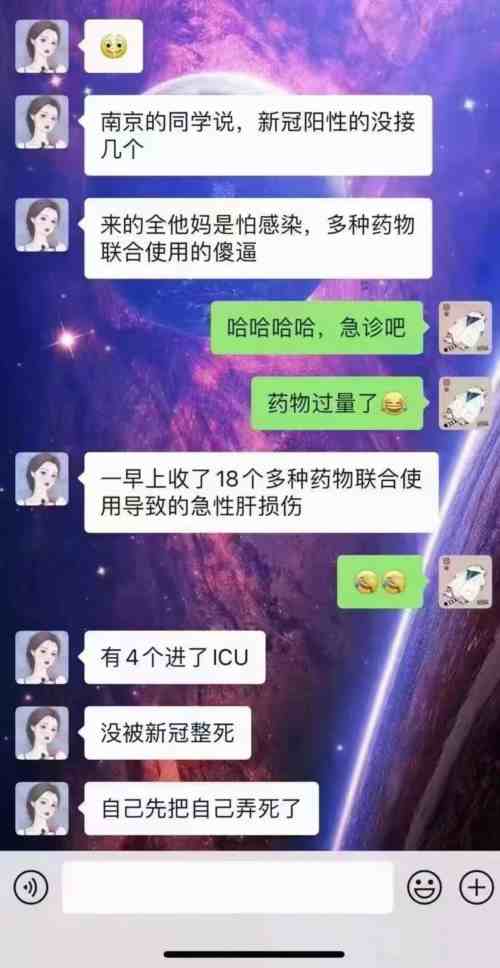 这两天,医生群里就在传一张图,说是南京这几天还没见到几个阳的,但一早上就收了18个自己乱吃药吃成急性肝损伤的,其中4个直接进了ICU,最好情况也就能活2个。