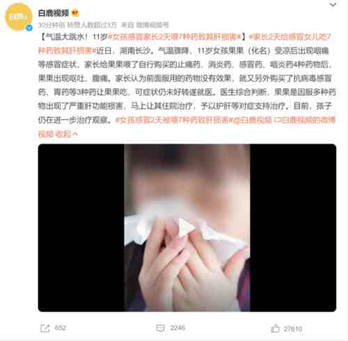 在湖南长沙,11岁的女孩果果着凉后出现咽痛等感冒症状,其家长给果果喂了自行购买的止痛药、消炎药、感冒药、咽炎药4种药物之后,果果出现呕吐、腹痛。之后家长自以为是此前的药物没有效果,又买了抗病毒感冒药、胃药等3种药让果果吃,但症状仍没好转。这时候家长才把孩子才送到医院,结果孩子被医生诊断为服用多种药物导致的严重肝功能损害。