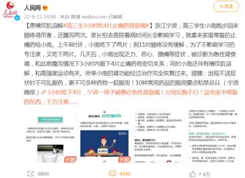 就在近一个月前,高三学生小南跑步回来腿疼得厉害,还腹泻了两次;然后在腹泻的前提下,小南3小时吃了家里自备的4片止痛药,再加上高强度运动引发的横纹肌溶解,小南出现了急性肾衰竭的症状。