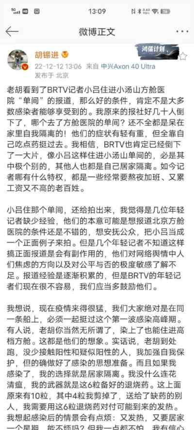 这位女记者阳了,发烧才38.2℃,就住进了小汤山方舱医院的单人间,这个方舱单人间不但有电视,还有空调,还有全国最顶尖的治疗专家。大家看到了吧,我早就说老胡的条件,咱们比不过,现在都看到了吧,连小记者的条件,咱们都比不过,人家阳了不但去方舱,而且去的是高级方舱,而咱们阳了只能在家扛。