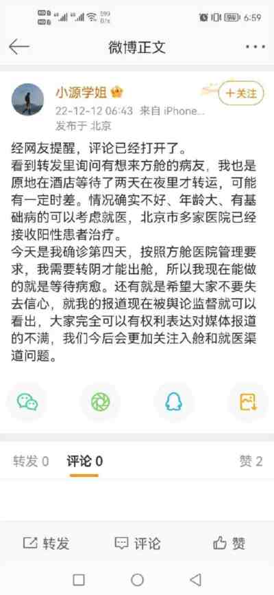 有人给这位女记者洗地说她是去小汤山方舱采访,感染了就留下来了。但是,没想到,这位女记者自己辟谣说,她是从酒店去的小汤山方舱医院。