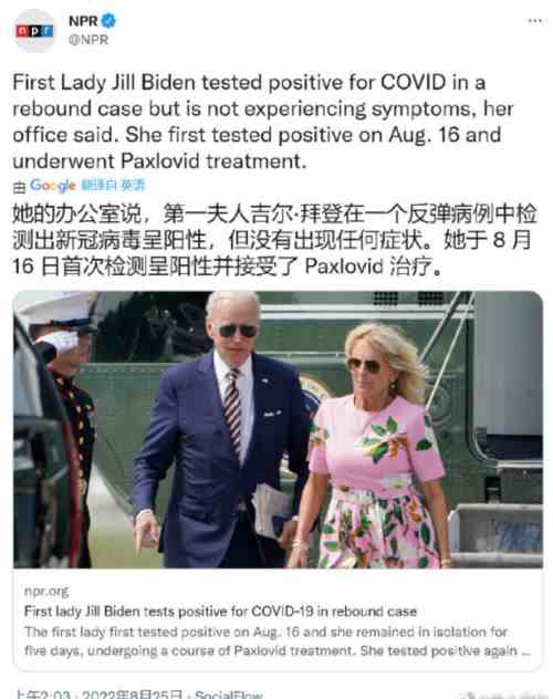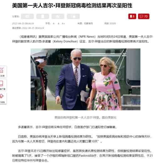 再比如美国第一夫人、美国总统的老婆吉尔,今年8月15日感染新冠,她被隔离了5天并接受了一个疗程的这款所谓的美国“特效药”的治疗后,转阴。可是到了当月24日就“还阳”了。