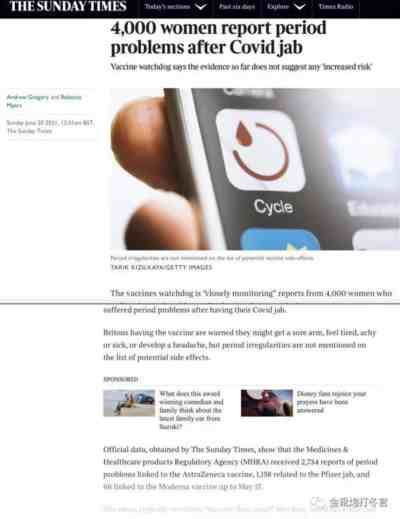 也是在去年,《星期日泰晤士报》曾发文称,约4000名英国女性报告在接种阿斯利康、辉瑞和莫德纳疫苗后,出现经血比平常更多、经期延迟、疼痛等异常状况。