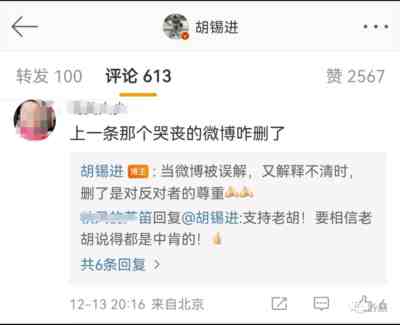 当然,这也不是老胡第一次删帖了。前几天不是还删了一个给网友的回复嘛。