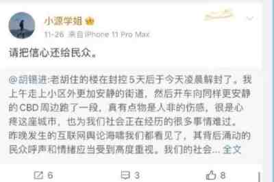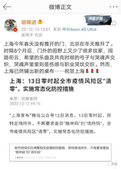 在短短的百余字里,老胡说“上海今年春天没有推开的门,北京冬天推开了”。这句话到底何意呢?是暗暗地指今天春天上海那波疫情没成功放开,终于在今年冬天实现了吗?