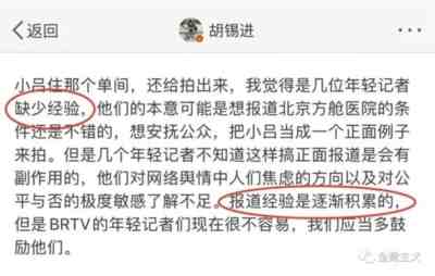 老胡这时候当然也是站在吕记者这边了,说她是“缺少经验”。
