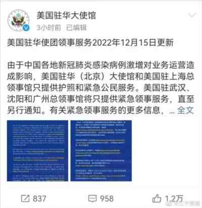 然而就在昨天,“国际”把轨给撤了,美国驻华大使馆称,因中国各地新冠病例激增,暂停所有常规签证服务。除上海总领事馆已计划提供的部分签证服务外,所有常规签证服务暂停;驻北京大使馆和其他总领事馆的所有常规预约都已取消。