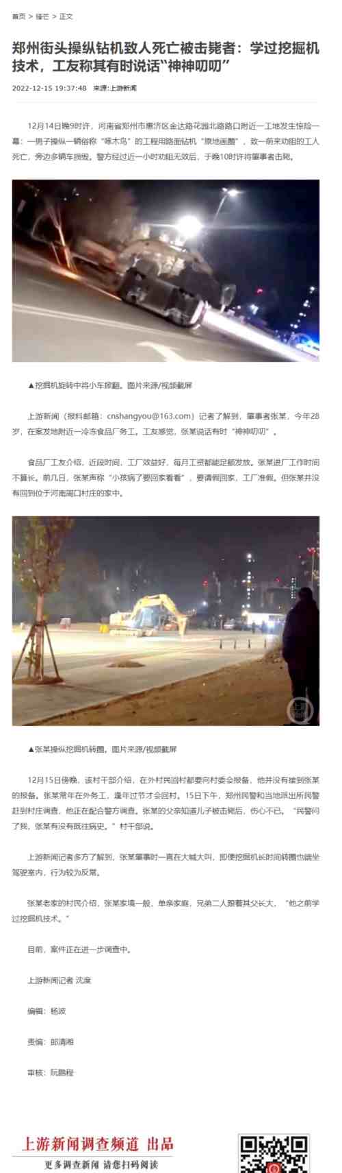 12月14日晚,河南郑州,惠济区金达路地铁站附近,一辆挖掘机安装破碎锤在马路中间失常旋转不停,现场至少一辆轿车被破坏,据多方媒体报道,该事件已造成人员伤亡,挖掘机驾驶者在现场被警方击毙。目前,肇事男子的身份、疾病史、肇事动机正在进一步调查中。