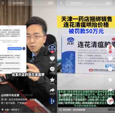 12月10日前后,有网友向成都市场监管局投诉某药店“捆绑销售连花清瘟”,要想购买连花清瘟胶囊,必须搭配其他一两百元的药品购买。四川成都市场监督管理局前往现场调查,核实群众反映情况属实。经查,药店也同样被上游经销商抬价、捆绑进货,因此药店选择强制消费者“购买套餐”,并加价售卖。目前,涉事药店被停业整顿,成都市场监管局也公开表态,将“调查整顿上游渠道”(这点,上文提到的闽清市场监管局应该好好学学,为群众办实事才是关键)。