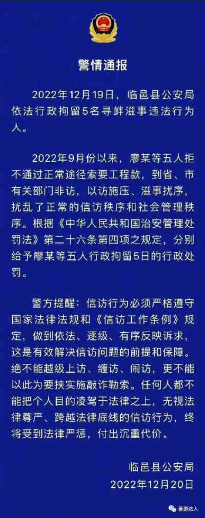 12月20日,山东德州,临邑县公安局通报:2022年12月19日,临邑县公安局依法行政拘留5名寻衅滋事违法行为人。2022年9月份以来,廖某等五人拒不通过正常途径索要工程款,到省、市有关部门非访,以访施压、滋事扰序,扰乱了正常的信访秩序和社会管理秩序。根据《中华人民共和国治安管理处罚法》第二十六条第四项之规定,分别给予廖某等五人行政拘留5日的行政处罚。