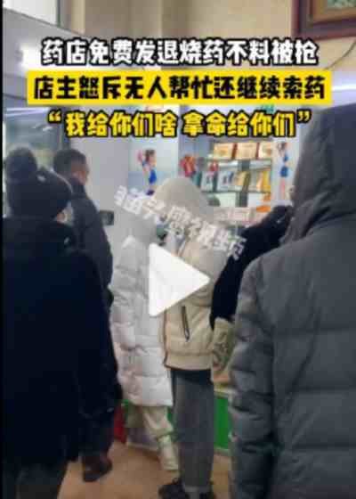 有好心的药店老板免费向人群发放退烧药,但却被人冲上来一把抢光。