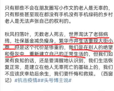 第一份来自于微博博主“大武汉美食排行榜”,他长文的主要意思是——“我错了,我也不知道病毒这么厉害,我只想着我们年轻力壮,没想过老人扛不过去,我们有罪.....”