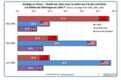 二战中,德国被击败,盟军取得胜利,这是一个事实。但这个胜利主要归因于谁,就可以岁月史书了。1945年,经历过二战的法国人,57%认为胜利归因于苏联。而60年后的2004年,58%的人认为归因于美国。