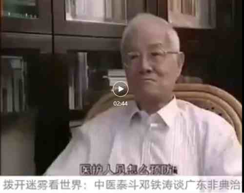 邓铁涛:吃中药啊,就靠吃中药。所以不需要靠那个多少层隔离衣啊,吃中药来增强身体的抵抗力。我们很潇洒,吃了这个预防药,戴个口罩就算了。我们第一附属医院零死亡,医生零感染。那个刘世昌比我还老两岁,89岁,他还去会诊呢......