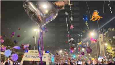 狂欢人群欢呼放飞手中气球,欢笑声盖住了那部救护车的哀鸣!