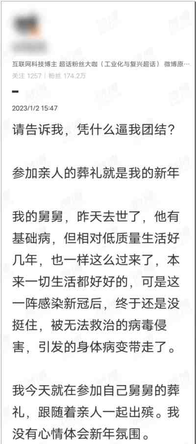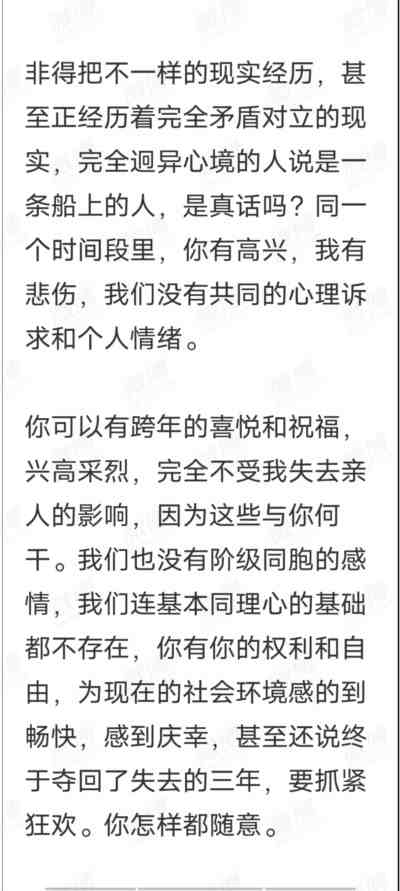 大家还记不记得,我们跨年的时候那一篇被删掉的文章,其中提到了“人类的悲喜并不相通”。这几天陆陆续续不断有网友和我们反映这个事情: