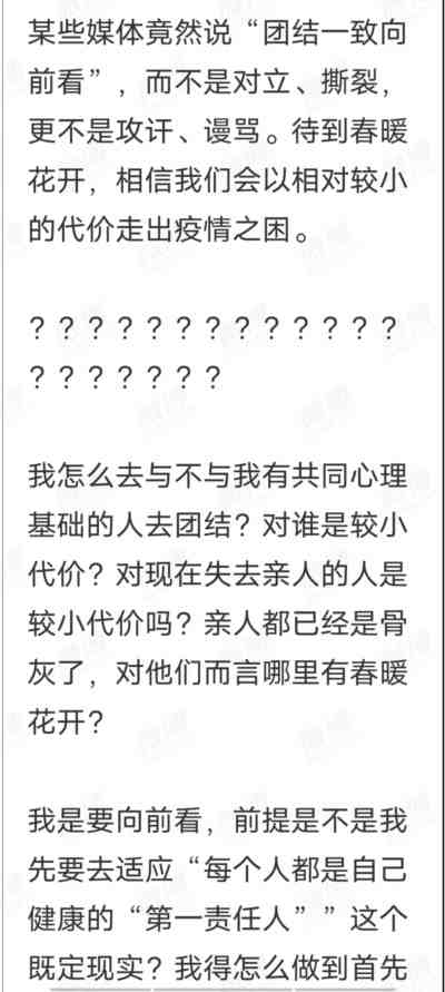 我们每天都在提醒大家,不要忘记现在的苦难,更不要掉以轻心,全国不知道有多少医护还在背后为我们每天没日没夜奋斗,这个社会还没有学会去面对那些错误,很多真实的数字还没得到披露,未来更不知道何去何从。