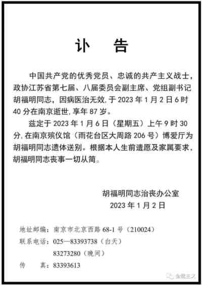 1月2日,南京大学哲学系教授胡福明同志去世。