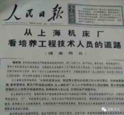 在那约莫十年前,1968年7月22日,《人民日报》公开发表过一篇名为《从上海机床厂看培养工程技术人员的道路》的调查报告,这份报告是由新华社、文汇报记者所写,于7月20日经文元同志给毛主席审阅并修改,后在调查报告的编者按语中引用了毛主席的一段谈话,在7月21日晚于中央人民广播电台播发,并在次日于22日见报《人民日报》。