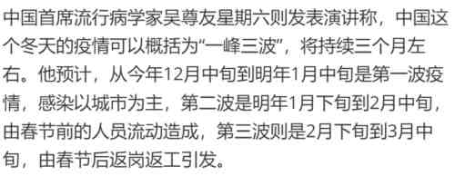 流行病学专家吴尊友研判:三个月,三波一峰,感染率10%-30%,病死率0.09%--0.16%。