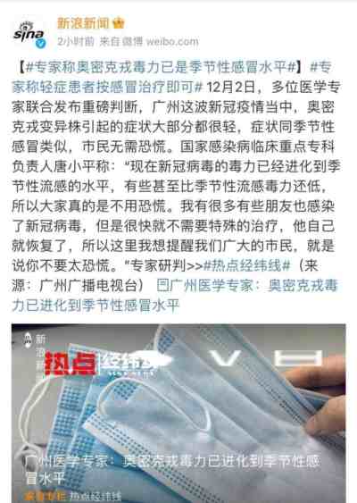 第五、12月2日,广州医科大学党委书记唐小平接受央视媒体采访时指出:“应该说90%以上都表现为无症状感染和非常轻的轻型表现,非常接近季节性流感”。当时,话题“专家称奥密克戎毒力已是季节性感冒水平”曾冲上热搜。