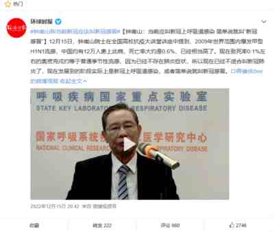 第六、12月15日,钟南山院士在全国高校抗疫大讲堂讲座中说“现在致死率0.1%左右的奥密克戎约等于普通季节性流感,因为已经不存在肺炎症状,所以现在已经不适合叫新冠肺炎了,现在发展到的阶段实际上是新冠上呼吸道感染,或者简单说就叫新冠感冒。”