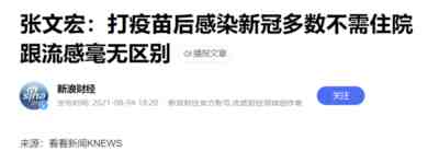 第一,2021年8月4日,国家传染病医学中心主任、复旦大学附属华山医院感染科主任张文宏说:打疫苗后感染新冠多数不需住院,跟流感毫无区别。