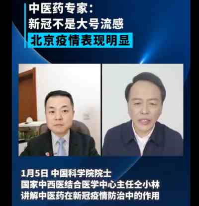 因为今天很多媒体、网络平台推送一条消息,说是在1月5日国家中西医结合医学中心主任仝小林在接受媒体采访时强调说:新冠不是大号流感,北京这波疫情症状明显,部分人转成肺炎,而且大部分患者中招时间很长。