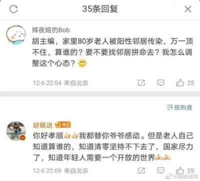 曾经有网友问老胡家里80岁的老人被阳性邻居传染,万一顶不住,该算谁的?老胡答曰,老人自己知道算谁的,知道年轻人需要一个开放的世界。