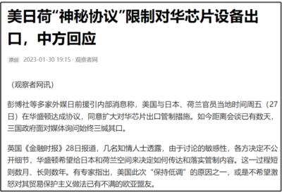 一个是美国最近和日本、荷兰,搞出一个“神秘协议”, 同意扩大对华芯片出口管制措施。