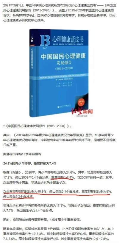 按照2021年3月1日中科院心理所发布的2020年版《中国国民心理健康发展报告(2019-2020)》,其中《2009年和2020年青少年心理健康状况的年际演变》显示2020年轻度抑郁为17.2%,高出2009年0.4%,而重度抑郁则为7.4%。