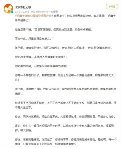 2月3日晚,北京市社会心理工作联合会(简称“北京市社心联”)官方微博发了个帖子,标题及“话题”居然是“胡鑫宇请给心理指导师五分钟”。