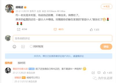 不过,与他的其他微博下一群抬轿的不同,这篇微博下绝大部分的人都在骂他,各种花样层出不穷,然而,一个人如果怕别人骂的,那么这个人大概不会成为一个坏人,所以,像胡锡进这样的人,又怎么会怕老百姓骂呢?在第一条评论中,有人说他新冠阳了觉得自己挺伟大,称为“阳伟‘,胡锡进也乐乐呵呵的接受了。