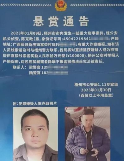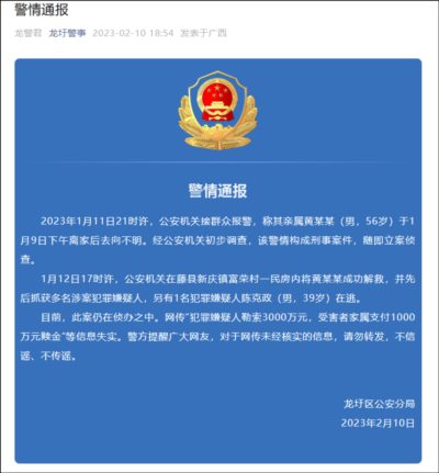 此前据相关媒体报道,2023年1月9日广西藤县富荣村村民陈克政涉嫌伙同他人绑架的对象为藤县原县委书记黄东明。一位接近案情的人士透露,黄东明被绑架后,绑匪勒索3000万元,黄东明家属在支付了1000万赎金后,绑匪未放人,家属报警。针对此,广西警方的通报称:网传“犯罪嫌疑人勒索3000万元,受害者家属支付1000万元赎金”等信息失实。