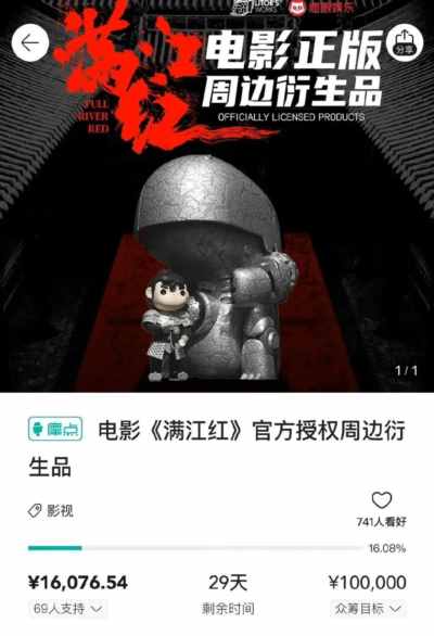 2月13日,电影《满江红》官方授权周边发布众筹,基础目标金额10万元。声称若众筹金额超30万元,将赠送Q版书签一套,超60万元将解锁“御赐令牌”,满100万元可解锁神秘赠品。