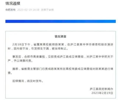 2月19日上午,一则题为“合肥教育名师陈宏友讲座中被学生轰下台”的视频+图文网帖在微博、抖音等多个网络平台上广为流传。