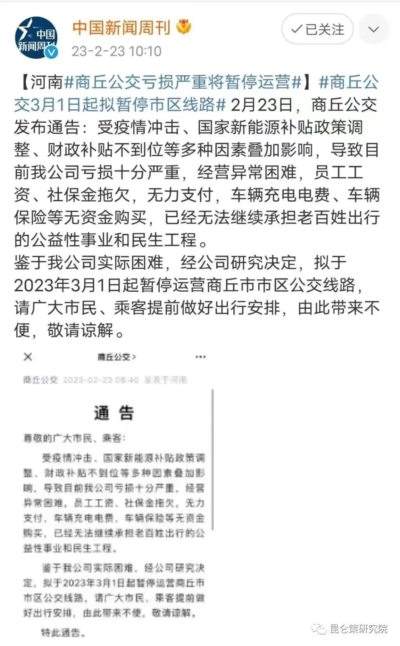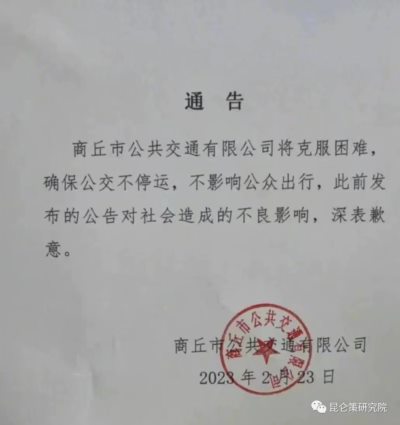 2月23日上午,商丘市公共交通有限公司在官方公众号“商丘公交”发布通告称,3月1日起暂停运营商丘市市区公交线路。