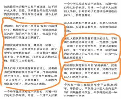“有些朋友联想到当年的‘白卷英雄’,就是感受到了这种反教育的力量 。只要政治正确,声音越大,杀伤力越大,这是几十年前人们熟悉的场景。”这个担忧毫无道理,庐江中学学生们喊的是:为中华民族之崛起而学习,不是为金钱而学习,也不是为美国而学习,更没有交白卷。杞人忧天!强行把此事与“几十年前人们熟悉的场景”拽到一起,心怀叵测,这是要构陷惨害孩子的。