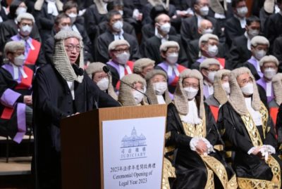 在香港2023年法律年度开启典礼上,发言人和前排就座的高级法官全部都戴着典型的英式司法假发。