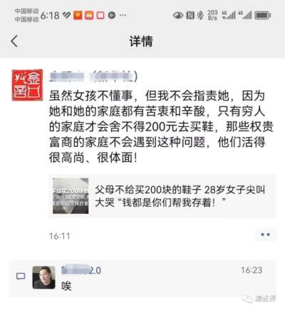 虽然女孩不懂事,但我不会指责她,因为她和她的家庭都有苦衷和辛酸,只有穷人的家庭才会舍不得200元去买鞋,那些权贵富商的家庭不会遇到这种问题,他们活得很高尚、很体面!