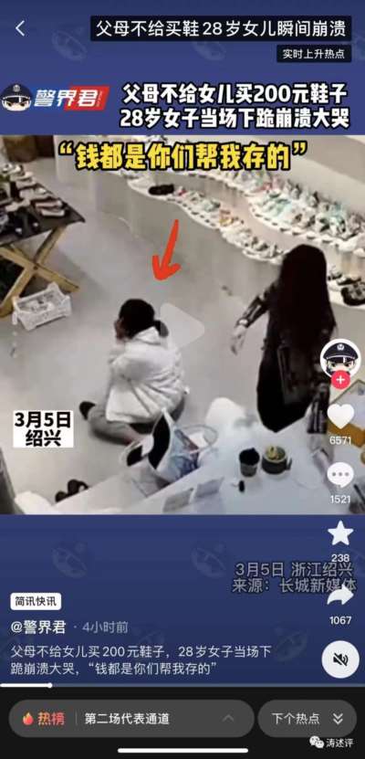 据说是在浙江绍兴,因为父母不给买200块的鞋子,28岁女子瞬间奔溃,当场下跪尖叫大哭,“钱都是你们帮我存着!”