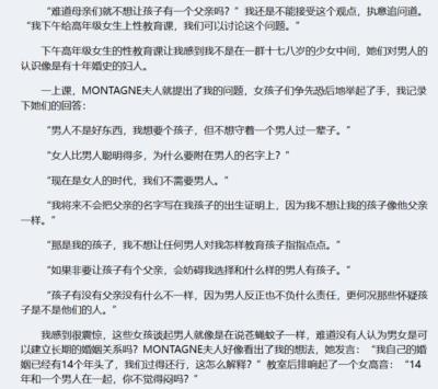 对于中产阶级女性,也就是“女权”运动的主力军,情况有所不同。这些女性主动选择单身的情况更多,主要原因就是碰不上她满意的男人,她遇到的男人都不能让她满意。在婚姻上“绝不凑合”,用做生意的方法来处理男女关系,导致她们中的很多人在婚姻上极为棘手。如果她们想要孩子,就产生了非婚生育的必要性。由于她们的经济实力较强、受教育程度较高,所以抚养孩子的难度会小一些。她们相对更加支持、至少是更加能接受未婚生育,认为这是对女性生育权的保障和尊重。只是她们不去考虑单亲家庭对孩子的负面影响。