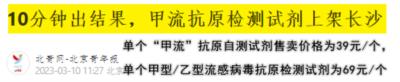 北青网消息,甲流抗原检测试剂盒已经上架,单个甲型/乙型试剂盒卖到69元一个,一盒20个要卖650元。