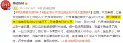 “价格55元到70元的甲流试剂盒,每个人限购20支,供不应求。医生建议大家不要囤货,无非就是39度40度的高烧加点咽痛咳嗽腹泻的症状……”这话怎么看,都有一股子凡尔赛的味道。本来没想囤的人,看到这些恐怕就真要去药店里走一趟了。